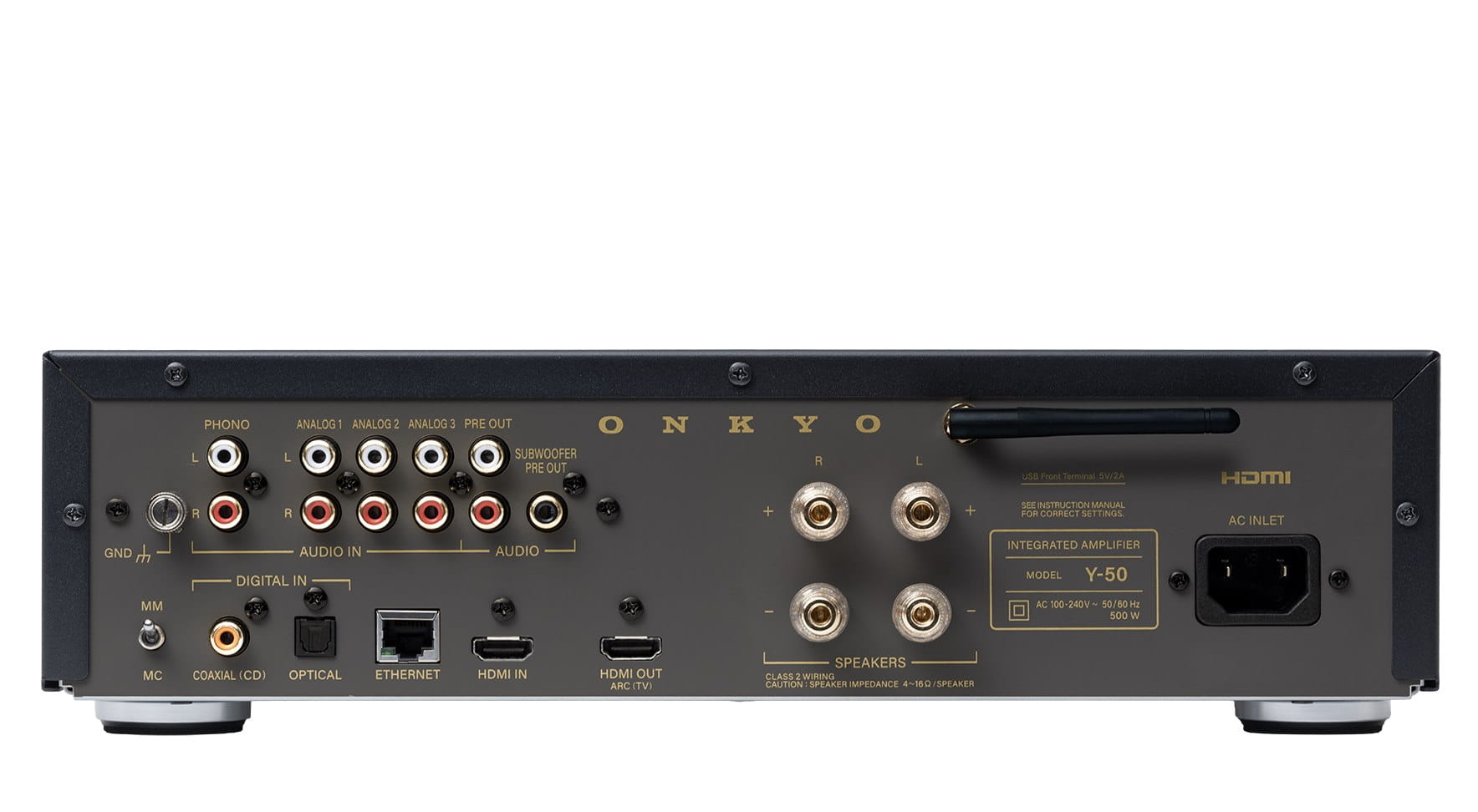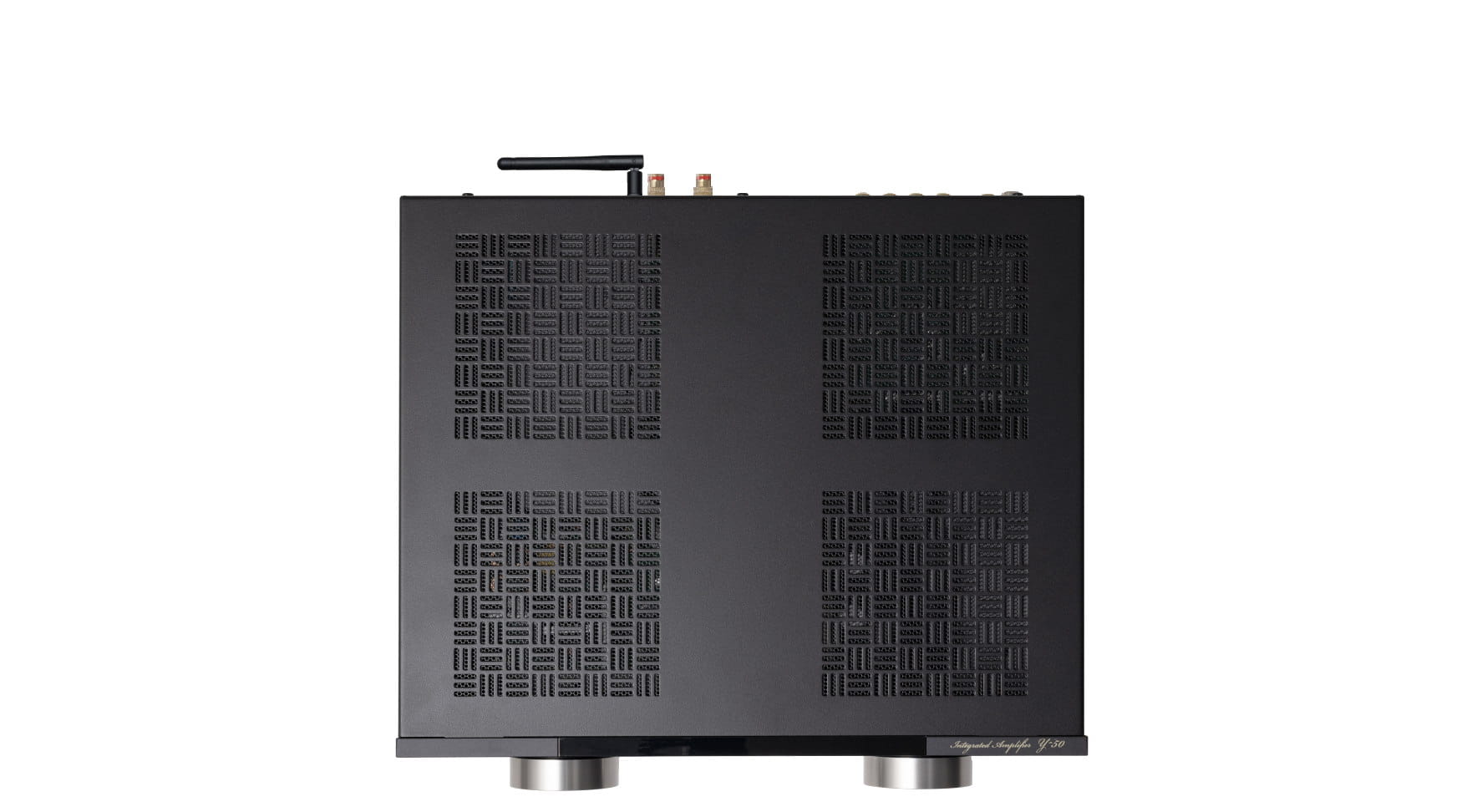 Niezachwiana dbałość o kunszt wykonania sprawia, że Y‑50 wyposażono w najwyższej klasy terminale głośnikowe audio‑grade. Aluminiowy panel frontowy nadaje urządzeniu elegancki, luksusowy charakter, a jednocześnie zapewnia wyjątkową sztywność konstrukcji, chroniąc brzmienie przed niepożądanymi wibracjami generowanymi przez głośniki. Charakterystycznie zdobiona, wentylowana pokrywa San Kuzushi subtelnie nawiązuje do japońskiej tradycji, jednocześnie dbając o skuteczne odprowadzanie ciepła.
