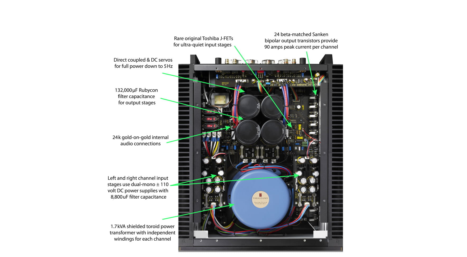 - Ekranowany transformator toroidalny 1,7 kVA z niezależnymi uzwojeniami dla każdego kanału